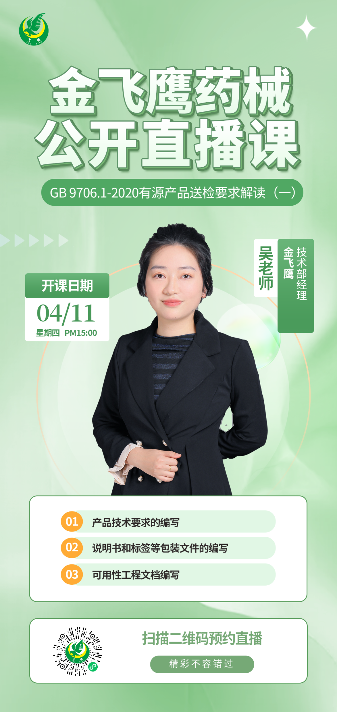 4月11日下午3點,金飛鷹技術部經理兼高級講師,有著近十年醫療器械行業工作經驗,尤為擅長【有源產品】合規準入上市認證的吳老師,給大家帶來《GB 9706.1-2020有源產品送檢要求解讀(一)》,培訓內容包括產品技術要求的編寫、說明書和標簽等包裝文件的編寫、可用性工程編寫等,因涉及到的內容較多,這一主題將分為兩期內容來講,大家記得要持續關注哦!