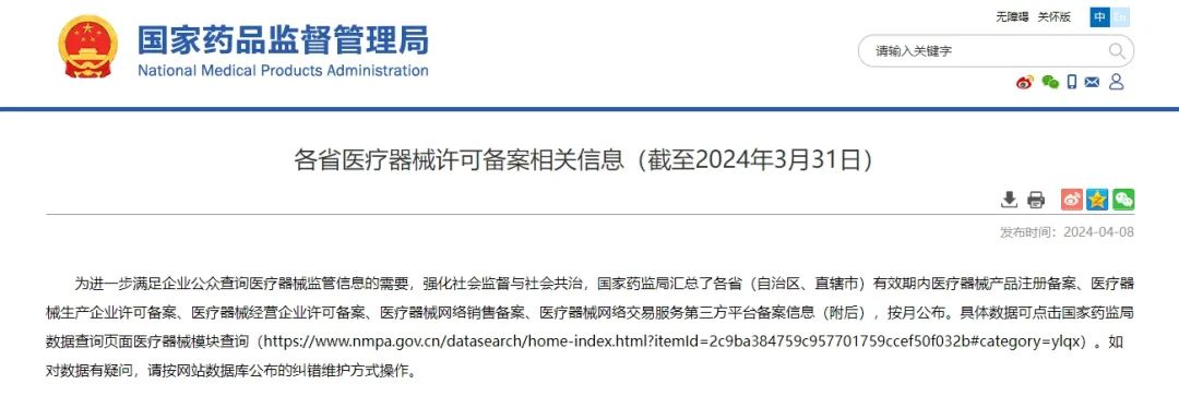 4月8日,國家藥監局公布了截至2024年3月31日各省有效期內醫療器械產品注冊備案、醫療器械生產企業許可備案等信息,老規矩,金飛鷹小編對此稍作編輯,標注紅色、綠色、黃色的分別為前三甲。