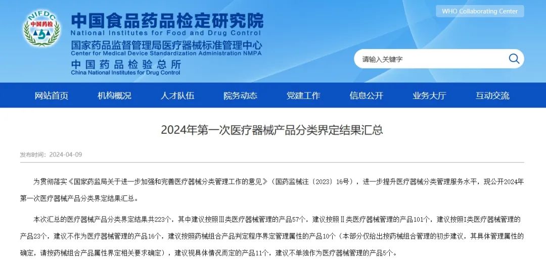 4月9日,國家藥監局醫療器械標準管理中心發布《2024年第一次醫療器械產品分類界定結果匯總》,本次共匯總了223個醫療器械產品分類界定結果,其中建議按照Ⅲ類醫療器械管理的產品57個,建議按照Ⅱ類醫療器械管理的產品101個,建議按照Ⅰ類醫療器械管理的產品23個,建議不作為醫療器械管理的產品16個,建議按照藥械組合產品判定程序界定管理屬性的產品10個,建議視具體情況而定的產品11個,建議不單獨作為醫療器械管理的產品5個