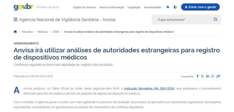 近日,Anvisa發布第290/2024號規范性指令,規定了審核和決定醫療器械注冊申請的簡化程序:經認可的海外監管機構(澳洲、加拿大、美國、日本)授權上市的Class Ⅲ、Class Ⅳ類高風險醫療器械,可根據公司的申請縮短其在巴西注冊的審核時間。此簡化程序的申請需提交相關文件,以證明進入巴西市場的產品與經認可的監管機構批準的產品有著相同的生產特征、適應癥和預期用途。