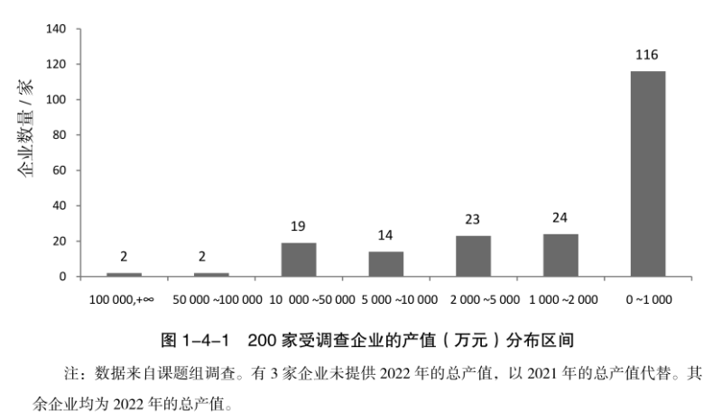 除上述23家企業外,還有37家企業的總產值在2000萬元至1億元(不含)之間,合計總產值在17億元左右,占樣本企業總產值的13%左右。在這37家企業中,總產值超過5000萬元的企業共有14家,剩下的23家企業總產值在2000萬~5000萬元。余下的140家注冊企業屬于總產值低于2000萬元的規模以下企業。這些企業雖然數量上占了樣本企業的70%,但是產值份額僅為6%左右。