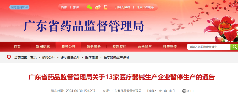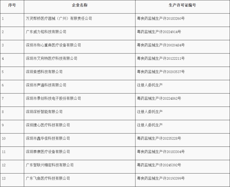 近期,廣東省藥品監督管理局組織開展醫療器械生產企業監督檢查,發現以下13家企業質量管理體系存在嚴重缺陷,不符合《醫療器械生產質量管理規范》相關規定,廣東省藥品監督管理局已依法采取責令暫停生產的控制措施。