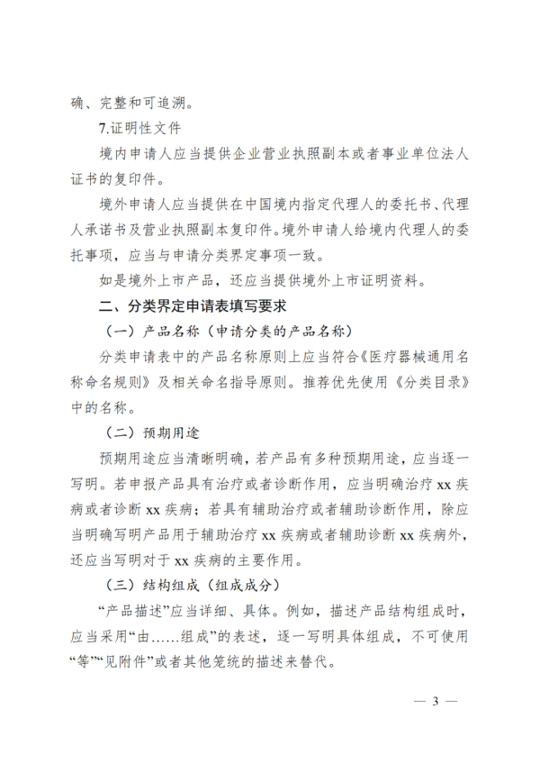 (二)申請人應(yīng)當(dāng)依據(jù)《條例》《辦法》《分類規(guī)則》、相關(guān)分類界定指導(dǎo)原則及《分類目錄》等判定產(chǎn)品管理屬性和類別。對新研制的尚未列入《分類目錄》的醫(yī)療器械,申請人可以直接申請第三類醫(yī)療器械產(chǎn)品注冊,也可以依據(jù)《分類規(guī)則》判斷產(chǎn)品類別并申請分類界定后,申請產(chǎn)品注冊或者辦理產(chǎn)品備案。