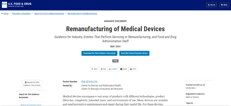 FDA動態丨“醫療器械再制造”最終指南發布