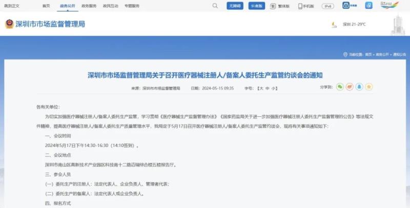 會議報名→5月17日,深圳市場監管局醫械委托生產監管約談會