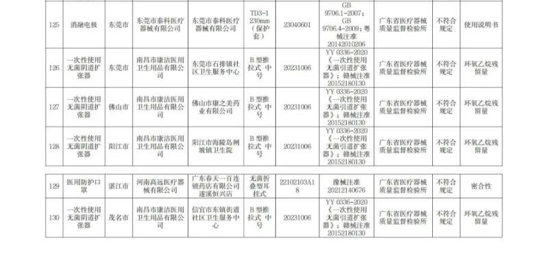 5月20日,廣東省藥監(jiān)局發(fā)布《關(guān)于醫(yī)療器械抽查檢驗(yàn)信息的通告(2024年第3期,總第88期)》(以下簡(jiǎn)稱(chēng)《通告》),《通告》顯示,該局共抽檢了130批次產(chǎn)品,共有6批次不合格,不合格產(chǎn)品包括消融電極、一次性使用無(wú)菌陰道擴(kuò)張器、醫(yī)用防護(hù)口罩,具體如下:
