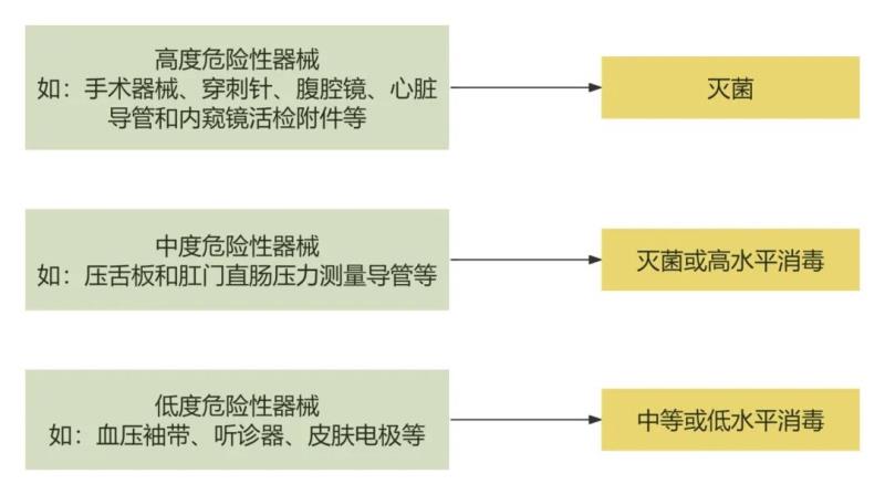消毒水平分為高、中、低三種水平消毒類(lèi)別。依據(jù)斯波爾丁分類(lèi)原則,器械分為高度危險(xiǎn)性、中度危險(xiǎn)性和低度危險(xiǎn)性器械,應(yīng)根據(jù)其可能引起的潛在感染風(fēng)險(xiǎn)程度來(lái)確定相應(yīng)的消毒水平。