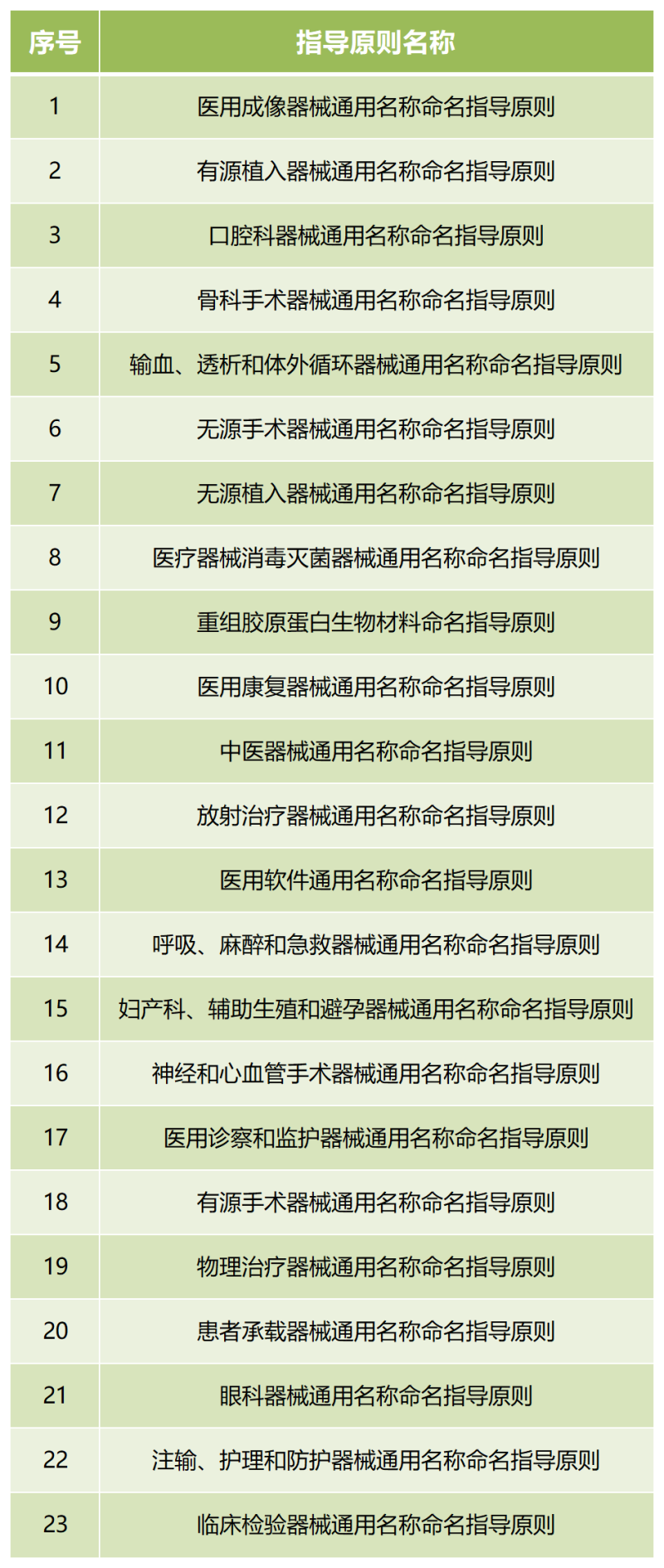 國家藥監局在2019年發布了《醫療器械通用名稱命名指導原則》,這是制定醫療器械通用名稱的基本技術要求,同時用于指導各專業領域的命名指導原則編制。而對于各專業領域存在的特殊情形,也有相應的命名指導原則進行具體說明。今天我們就匯總了物理治療器械、醫用康復器械、醫用軟件等23類醫療器械產品通用名稱命名指導原則,具體如下: