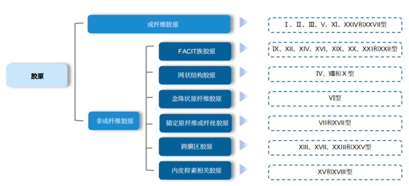 按照被發(fā)現(xiàn)的先后順序,膠原蛋白可分為Ⅰ型膠原、Ⅱ型膠原和Ⅲ型膠原,以此類推。對(duì)人體來說,最常見的膠原主要有四種形態(tài):① 膠原Ⅰ型(主要存在于成人皮膚和骨組織,數(shù)量最大);② 膠原Ⅱ型(主要存在于軟骨組織);③ 膠原Ⅲ型(主要存在于嬰幼兒皮膚或血管、內(nèi)膜、腸、胃器官);④ 膠原Ⅳ型(主要存在于各組織器官的基底膜、胎盤和晶狀體)。