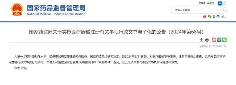 近日,國(guó)家藥監(jiān)局發(fā)布公告稱,自2024年6月1日起,對(duì)醫(yī)療器械不予注冊(cè)、注冊(cè)申請(qǐng)終止審查、說(shuō)明書(shū)更改不予同意等行政文書(shū)實(shí)行電子化,申請(qǐng)人可通過(guò)國(guó)家藥監(jiān)局政務(wù)服務(wù)門(mén)戶“我的辦件”查詢。以上電子文書(shū)與紙質(zhì)文書(shū)具有同等法律效力。