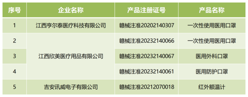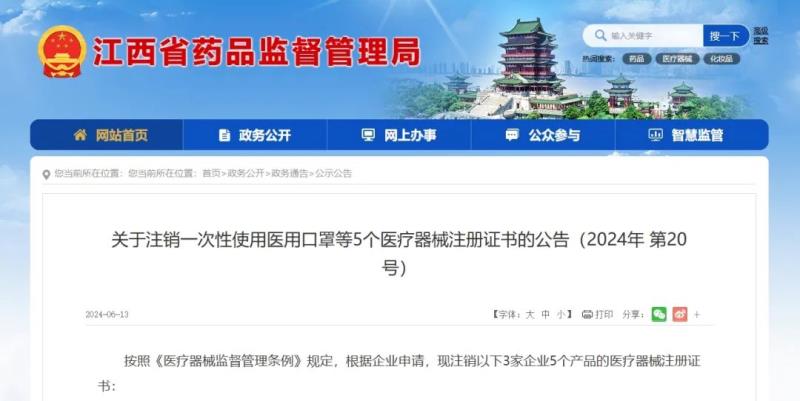 6月13日,江西省藥監(jiān)局發(fā)布一則注銷公告,其中提到,按照《醫(yī)療器械監(jiān)督管理條例》規(guī)定,根據企業(yè)申請,注銷江西欣美醫(yī)療用品有限公司等3家企業(yè)5個產品(主要為醫(yī)用口罩及紅外額溫計)的醫(yī)療器械注冊證書,具體明細如下: