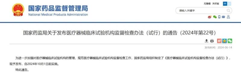 近日,國家藥監局組織發布《醫療器械臨床試驗機構監督檢查辦法(試行)》(以下簡稱《辦法》),并宣布自2024年10月1日起實施。