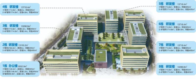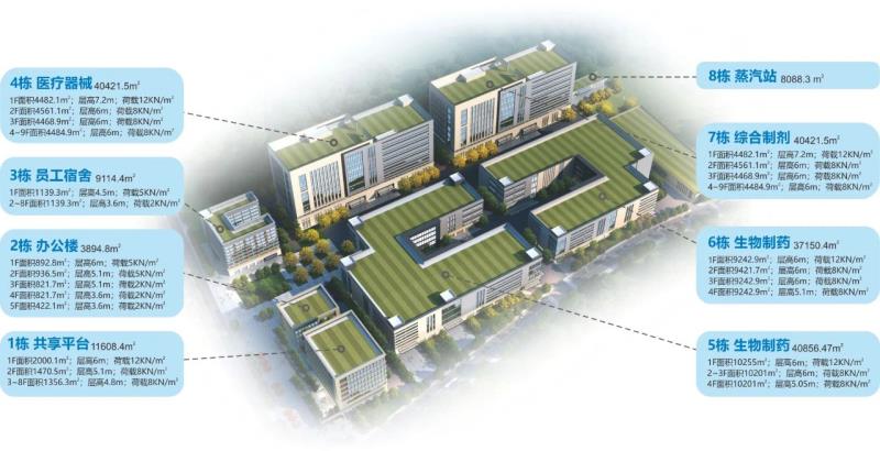三醫智造中心一期為工業載體,總占地123畝,總建筑面積25萬㎡,其中產業建筑面積18.3萬㎡,建設高承重、高層高標準廠房,配置雙回路供電、蒸汽站、污水處理站、危化庫、倒班房等設施。層高4.8-7.2m,承重0.8-1.2噸,面積單層最大可達1萬㎡。主要引入綜合制劑、生物技術藥、醫療器械、細胞治療、綠色食品、電子信息等項目的中試與生產。