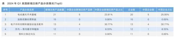 從整體注冊情況來看,2024年一季度,中國企業在美國獲批醫療器械產品中,“經皮神經電刺激儀(用于非處方用途)”的產品數量最多;其次是“電動激光手術器械”,產品數量為5件,占該分類新注冊產品總數的23.81%,涉及中國企業5家,占該分類注冊企業總數的25.00%。