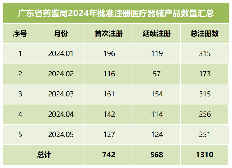 我們同步匯總了2024年前5個月廣東省藥監局批準注冊的醫療器械產品數量(見下方表格),從表格中可以看出,截至5月底,2024年廣東省藥監局總計批準注冊第二類醫療器械產品1310個,其中首次注冊742個,延續注冊568個。