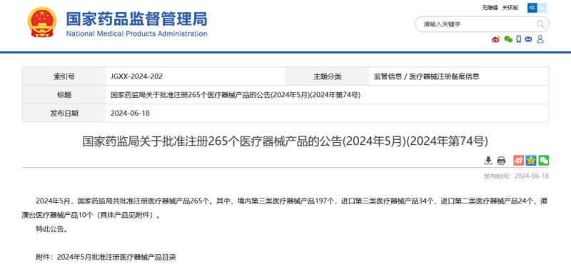 6月18日,國家藥監局官網發布公告稱,2024年5月,國家藥監局共批準注冊醫療器械產品265個。其中,境內第三類醫療器械產品197個,進口第三類醫療器械產品34個,進口第二類醫療器械產品24個,港澳臺醫療器械產品10個。