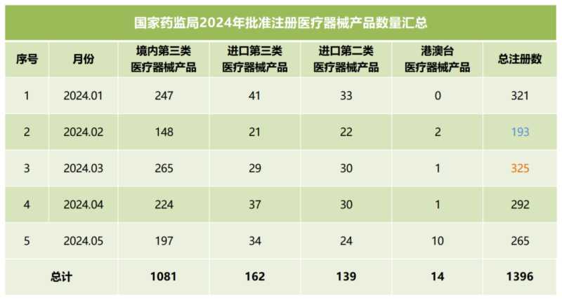 我們同步匯總了2024年前五個月國家藥監局批準注冊的醫療器械產品數量(見下方表格),從表格中可以看出,截至5月,2024年國家藥監局總計批準注冊醫療器械產品1396個,其中境內第三類醫療器械產品1081個,進口第三類醫療器械產品162個,進口第二類醫療器械產品139個,港澳臺醫療器械產品14個。