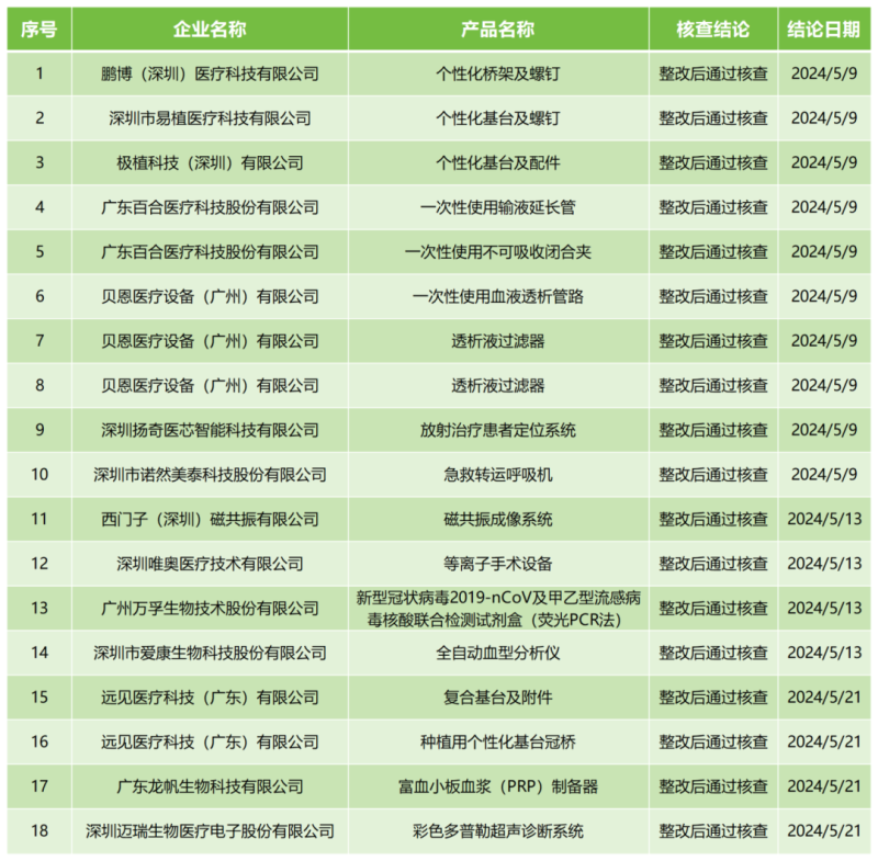 6月25日,廣東省藥監局官網公布2024年5月醫療器械注冊質量管理體系核查結果,包括西門子(深圳)磁共振有限公司的磁共振成像系統、深圳唯奧醫療技術有限公司的等離子手術設備、深圳邁瑞生物醫療電子股份有限公司的彩色多普勒超聲診斷系統等共計18款產品,均為“整改后通過核查”。具體明細見下方表格: