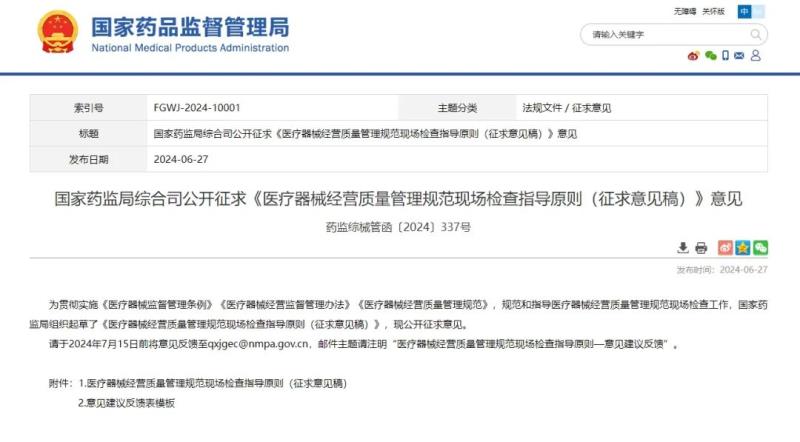 6月28日,國家藥監(jiān)局發(fā)布《醫(yī)療器械經營質量管理規(guī)范現場檢查指導原則(征求意見稿)》(以下簡稱《指導原則》),并向社會公開征求意見。