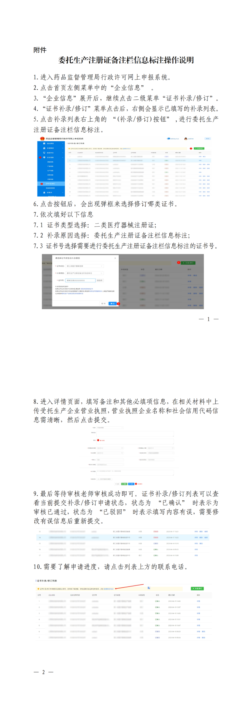 一、自2024年6月1日起,涉及境內(nèi)委托生產(chǎn)的注冊申請或者延續(xù)注冊申請,省局將在醫(yī)療器械注冊證生產(chǎn)地址欄中登載受托生產(chǎn)地址并注明“(委托生產(chǎn))”,同時在備注欄備注受托生產(chǎn)企業(yè)名稱和統(tǒng)一社會信用代碼,備注形式為“受托生產(chǎn)企業(yè):XXXX公司;統(tǒng)一社會信用代碼:XXXX”。變更注冊涉及注冊人委托生產(chǎn)的,也將在變更注冊文件中按照上述方式注明委托生產(chǎn)相關信息,并將變更信息在注冊證書生產(chǎn)地址和備注相應字段中更新。 二、僅受托生產(chǎn)企業(yè)名稱文字性變化的,無需申請變更備案,在延續(xù)注冊時,核發(fā)修改后的注冊證。 三、對省內(nèi)已核發(fā)的涉及境內(nèi)委托生產(chǎn)的注冊證,若未按照上述要求標注相關信息,注冊人可按照附件操作說明申請標注,相關工作應在8月31日前完成。 四、注冊人不再進行委托生產(chǎn)的,應當及時向省局核減受托生產(chǎn)地址;受托生產(chǎn)企業(yè)應當及時向所在地省級藥品監(jiān)督管理部門報告有關情況。 五、注冊人在申請標注過程中存在疑問的,可與省局相關部門聯(lián)系。醫(yī)療器械注冊管理處,0791-88158031;系統(tǒng)運維工程師,0791-88125223(吳工)、0791-86507350(涂工)。