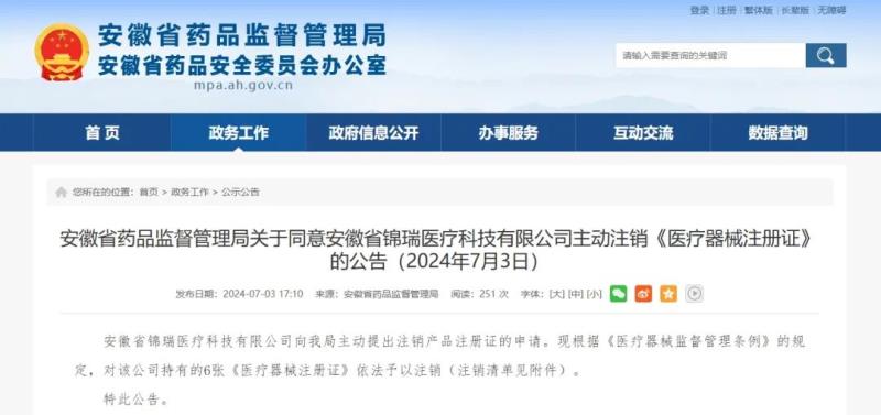 近日,安徽省藥監局發布公告稱安徽省錦瑞醫療科技有限公司向該局主動提出注銷產品注冊證的申請。根據《醫療器械監督管理條例》的規定,對該公司持有的6張《醫療器械注冊證》依法予以注銷。我們通過查看附件發現,此次注銷的產品均為醫用口罩具體明細如下:
