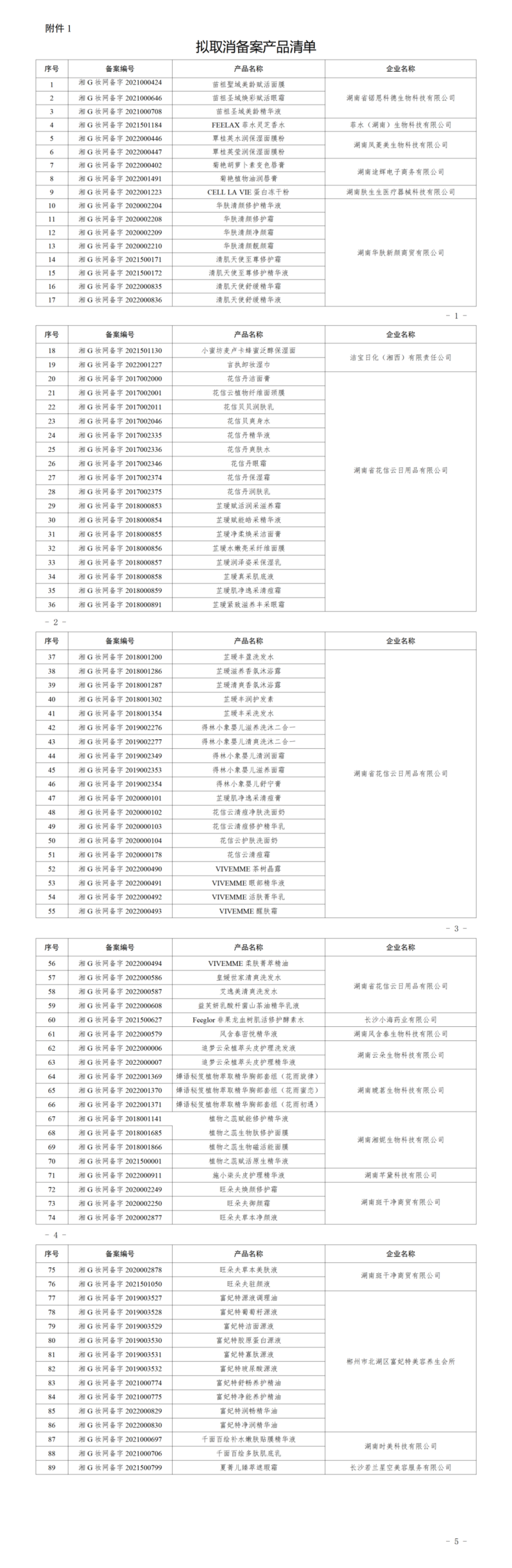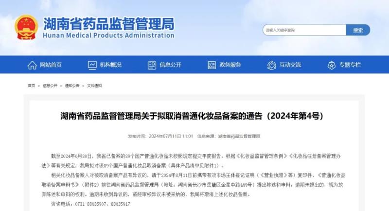 近日,湖南藥監局發布《關于擬取消普通化妝品備案的通告(2024年第4號)》,其中提到,截至2024年6月30日,該省已備案的89個國產普通化妝品未按照規定提交年度報告。根據《化妝品監督管理條例》《化妝品注冊備案管理辦法》等有關規定,該局擬對該89個國產普通化妝品取消備案,具體產品清單如下: