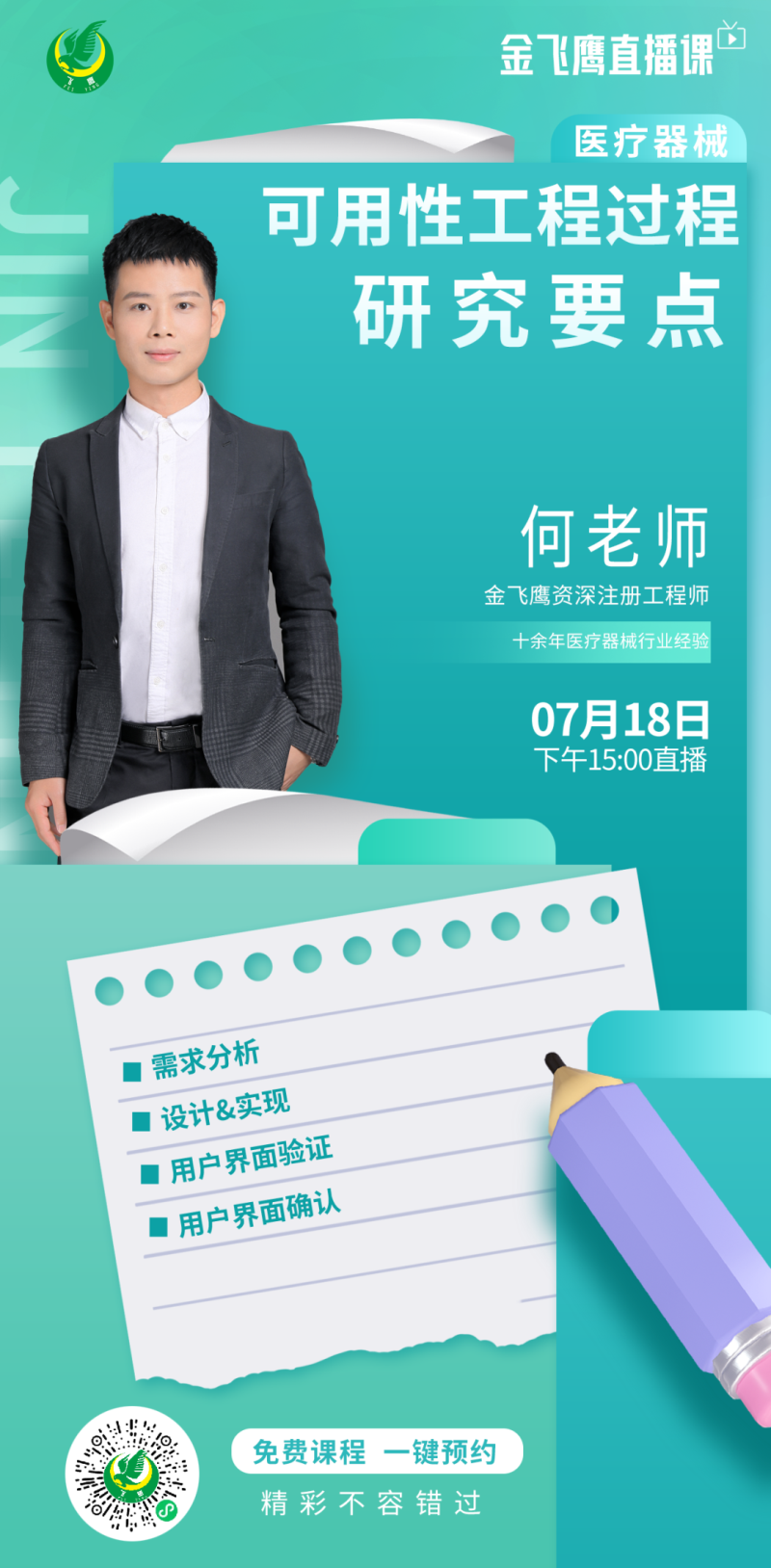 7月18日下午3點,金飛鷹資深注冊工程師,擁有十余年醫療器械行業經驗,對可用性工程頗有研究的何老師,繼續給大家帶來《醫療器械可用性工程過程研究要點》,培訓內容包括需求分析、設計&實現、用戶界面驗證、用戶界面確認,大家千萬不要錯過了哦!