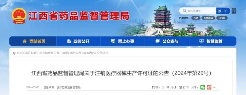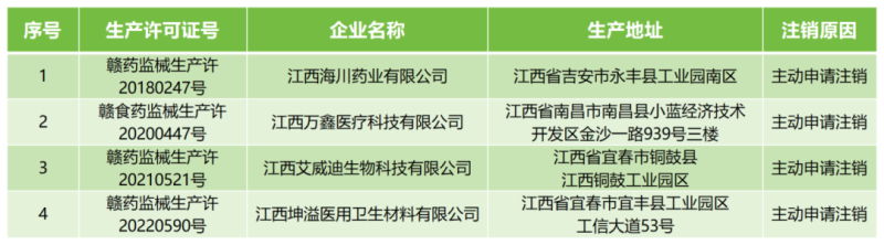 7月17日,江西省藥監局發布公告稱,該局已依法注銷江西海川藥業有限公司、江西萬鑫醫療科技有限公司等4家企業的《醫療器械生產許可證》,注銷原因均為“企業主動申請注銷,具體明細如下: