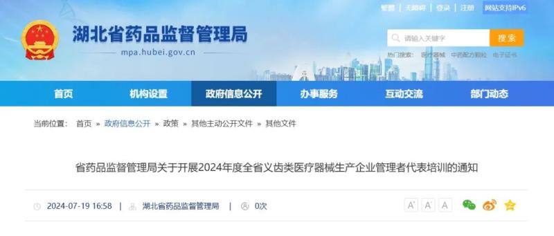 近日,湖北省藥監局發布《關于開展2024年度全省義齒類醫療器械生產企業管理者代表培訓的通知》,有關事項通知如下: