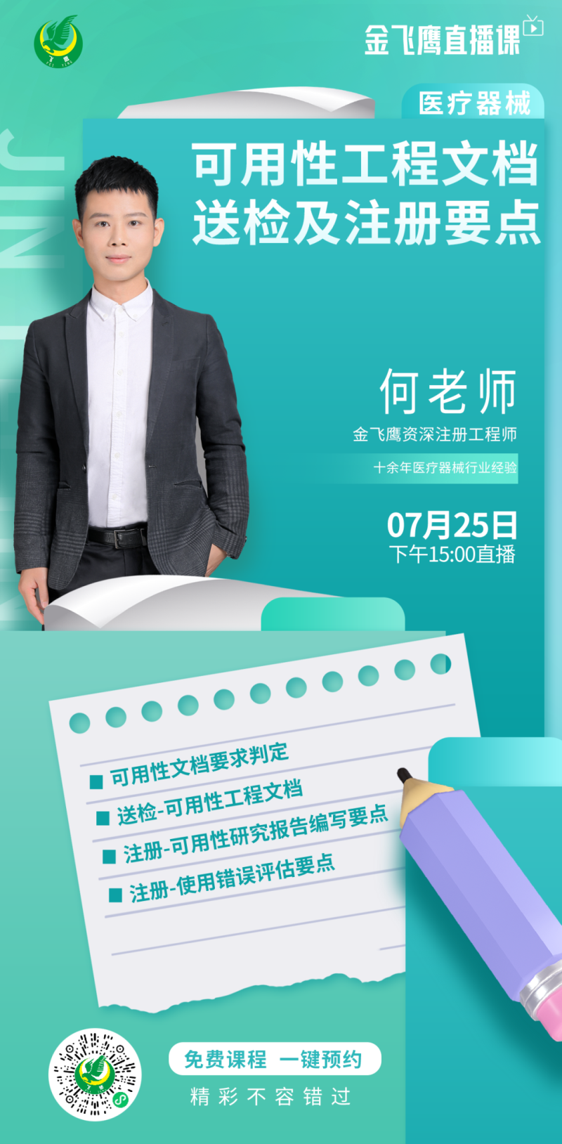 7月25日下午3點,金飛鷹資深注冊工程師,擁有十余年醫療器械行業經驗,對可用性工程頗有研究的何老師繼續給大家帶來《醫療器械可用性工程文檔送檢及注冊要點培訓內容包括可用性文檔要求判定、送檢環節的可用性工程文檔要求、注冊環節的可用性研究報告編寫要點使用錯誤評估要點大家千萬不要錯過了哦!