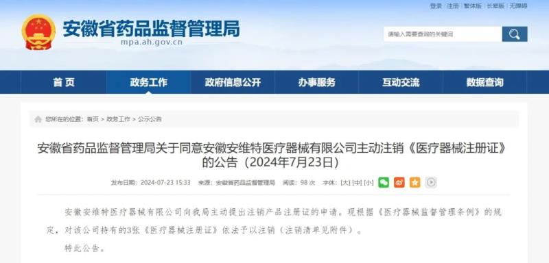 7月23日,安徽省藥監局發布公告稱,安徽安維特醫療器械有限公司向該局主動提出注銷產品注冊證的申請。根據《醫療器械監督管理條例》的規定,安徽省藥監局對這家公司持有的3張《醫療器械注冊證》依法予以注銷,注銷清單具體如下: