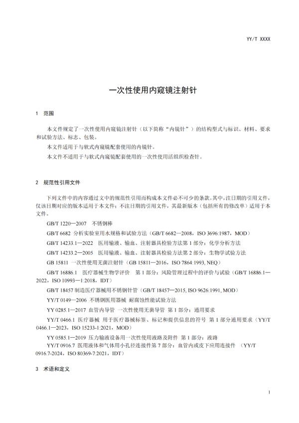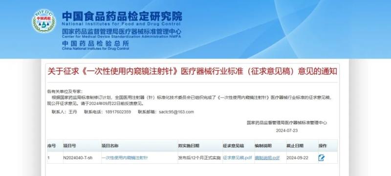 7月23日,國家藥監局醫療器械標準管理中心發布《一次性使用內窺鏡注射針》醫療器械行業標準的征求意見稿,并向社會公開征求意見。