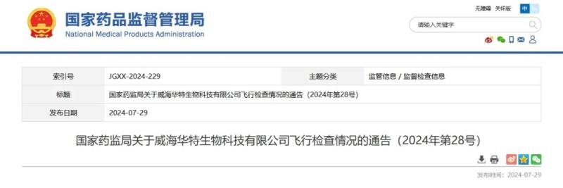 7月29日,國家藥監局發布通告稱,該局組織檢查組對威海**生物科技有限公司進行飛行檢查,發現該企業質量管理體系主要存在以下缺陷: