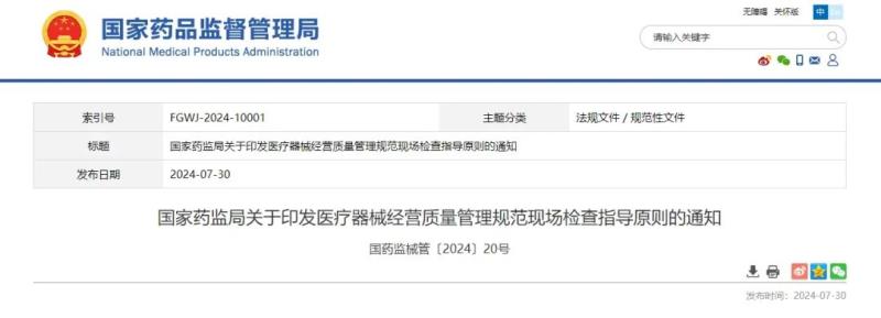 7月30日,國家藥監局發布《醫療器械經營質量管理規范現場檢查指導原則》(以下簡稱《指導原則》),并宣布自發布之日起施行。原食品藥品監管總局印發的《醫療器械經營質量管理規范現場檢查指導原則》(食藥監械監〔2015〕239號)同時廢止。