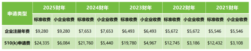 接下來(lái),我們將近幾年來(lái)的企業(yè)注冊(cè)年費(fèi)和510(k)申請(qǐng)費(fèi)匯總至下方表格,從表格可以看出,這兩項(xiàng)費(fèi)用每年都有上漲,其中510(k)申請(qǐng)費(fèi)(標(biāo)準(zhǔn)收費(fèi))從2021財(cái)年的$12432到2025財(cái)年的$24335,漲幅接近100%: