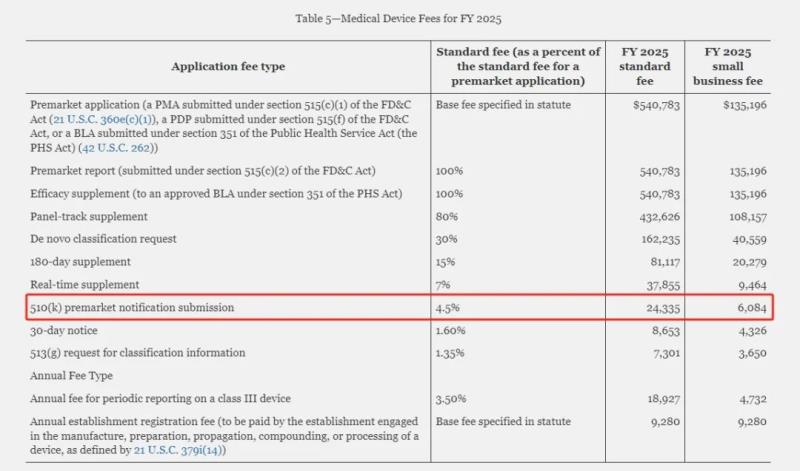 具體來(lái)說(shuō),企業(yè)注冊(cè)年費(fèi)漲至$9280,相比2023財(cái)年的$7653上漲了$1627,漲幅21.2%;510(k)申請(qǐng)費(fèi)(標(biāo)準(zhǔn)收費(fèi))漲至$24335,相比2023財(cái)年的$21760上漲了$2575,漲幅11.8%。當(dāng)然,如果申請(qǐng)了小企業(yè)資質(zhì),企業(yè)的510(k)申請(qǐng)費(fèi)是會(huì)便宜很多的,2025財(cái)年是6084美元(2024財(cái)年則是5440美元)。