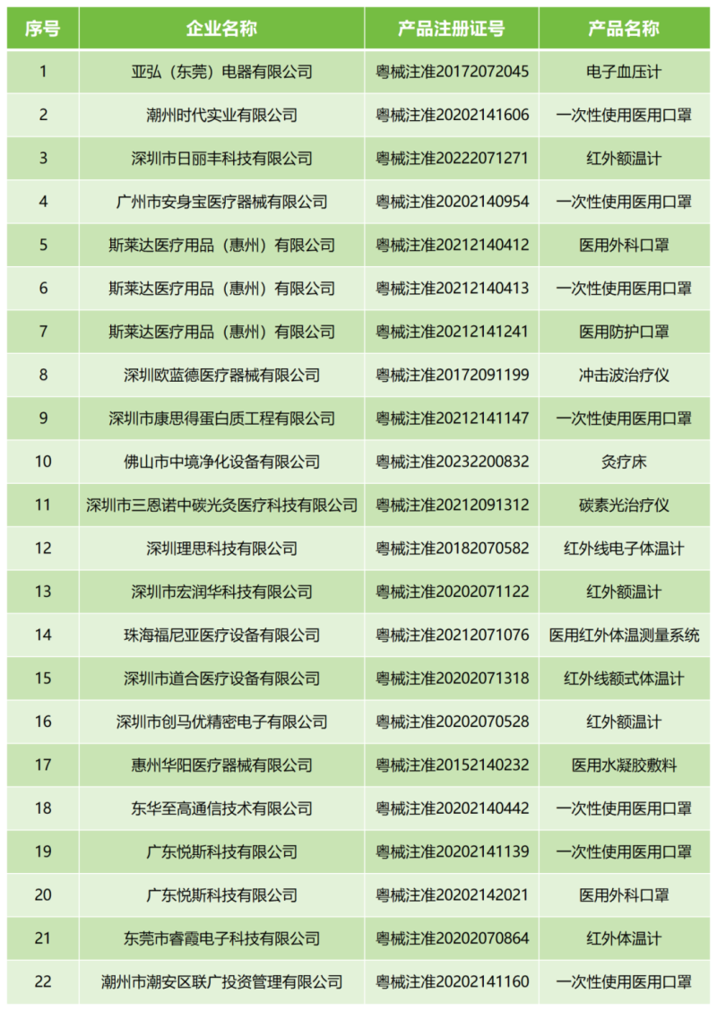 8月1日,廣東藥監局發布通告稱,亞弘(東莞)電器有限公司、斯萊達醫療用品(惠州)有限公司、深圳理思科技有限公司等19家注冊人向廣東省藥品監督管理局主動提出注銷產品注冊證的申請,我們通過查看附件發現,注銷產品中依然以醫用口罩居多(占比近一半),還有額溫計、體溫計、沖擊波治療儀、灸療床等共22款產品。具體清單如下: