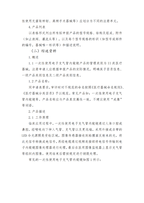 該指南適用于《醫療器械分類目錄》(國家食品藥品監督管理總局公告2017年第 104號)中分類編碼為06-14-03經滅菌處理的一次性使用電子支氣管內窺鏡的注冊審評。對可重復使用的電子支氣管內窺鏡、氣管插管用喉鏡不適用。