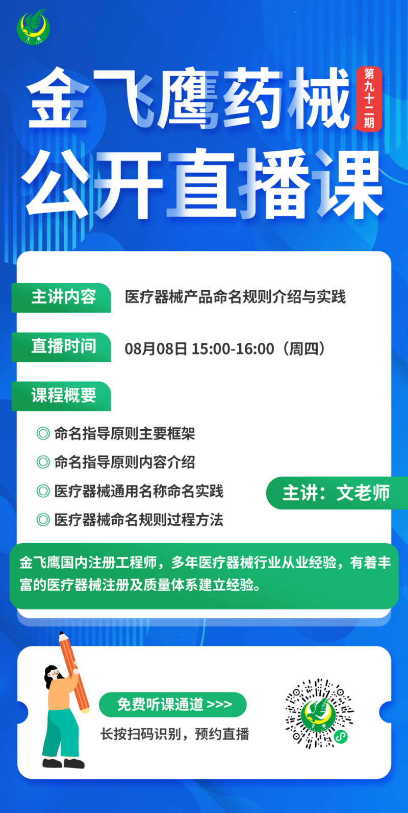 金飛鷹直播培訓(xùn),是每周一次的固定培訓(xùn)欄目,優(yōu)選金飛鷹國內(nèi)外資深注冊/項(xiàng)目老師定期為大家講解醫(yī)療器械注冊相關(guān)知識,解答大家在醫(yī)療器械注冊過程中的諸多疑問。