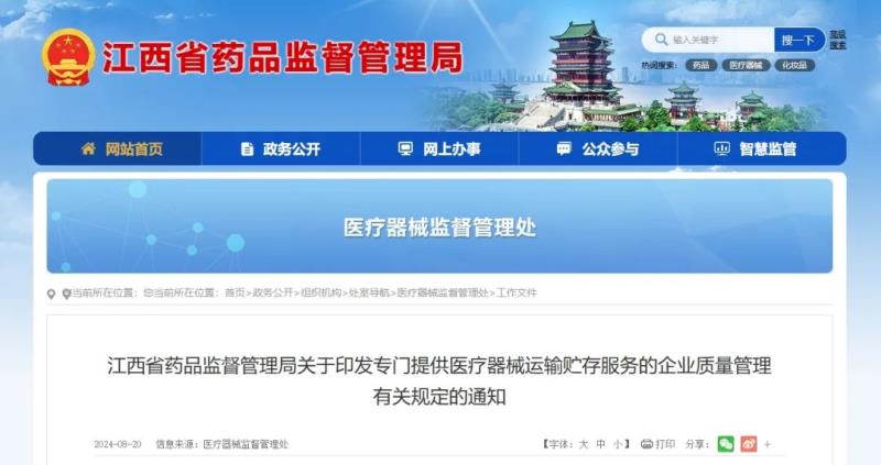 8月20日,江西省藥監局發布《專門提供醫療器械運輸貯存服務的企業質量管理有關規定》(以下簡稱《規定》),并宣布自2025年1月1日起施行。