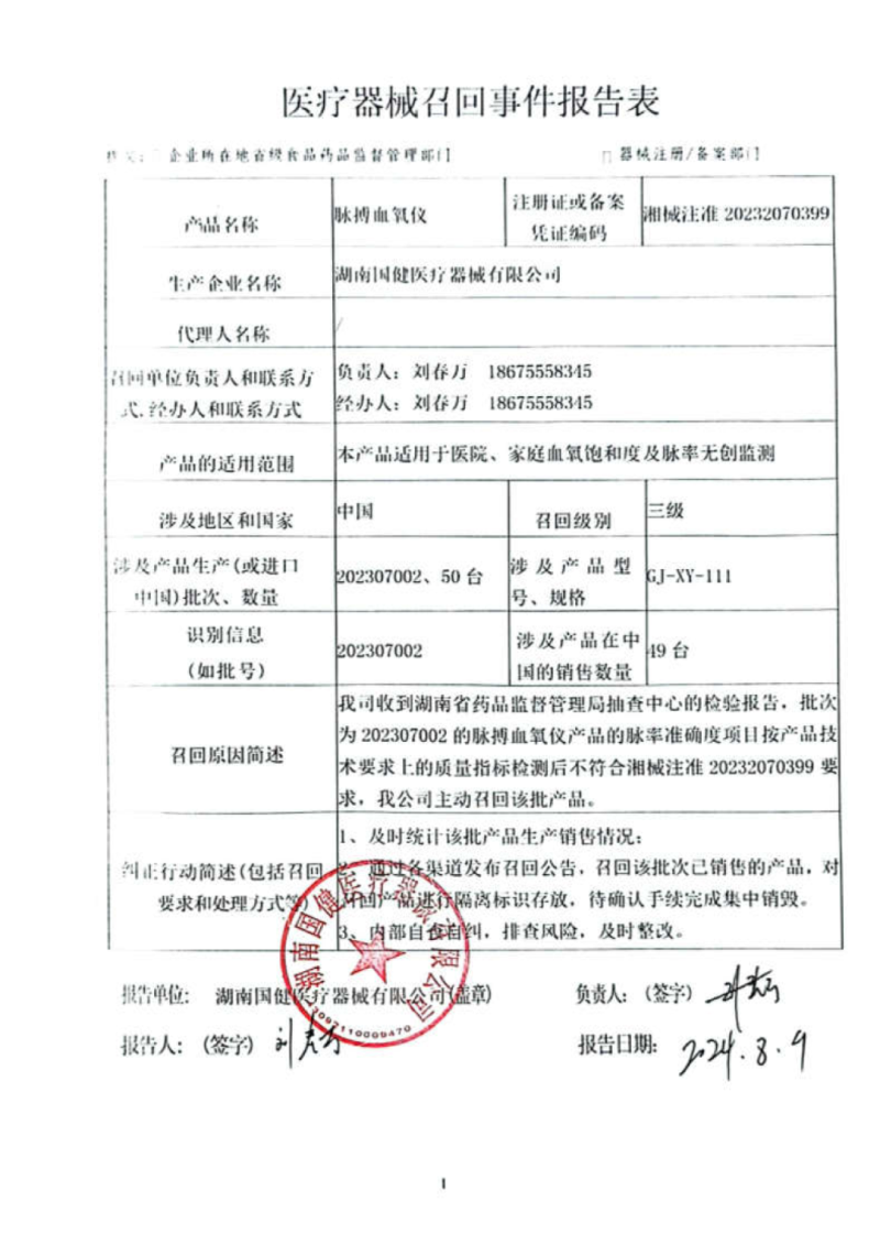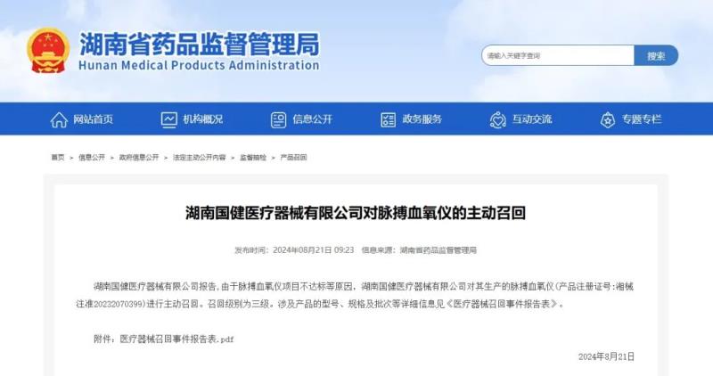 8月21日,湖南省藥監局官網發布一則召回公告,其中提到,由于脈搏血氧儀項目不達標等原因,湖南國健醫療器械有限公司對其生產的脈搏血氧儀(產品注冊證號:湘械注準20232070399)進行主動召回。召回級別為三級。通過查看附件《醫療器械召回事件報告表》我們可以發現,涉及產品已在中國銷售49臺。