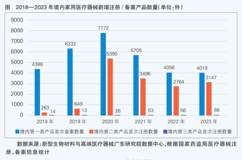 統(tǒng)計(jì)數(shù)據(jù)顯示,境內(nèi)家用醫(yī)療器械新增注冊(cè)及備案數(shù)量在2019年和2020年均有較大提升,2021年開始有所回落,2023年相較于2022年又出現(xiàn)小幅增長(zhǎng)。其中,2020年受新冠疫情影響,家用醫(yī)療器械產(chǎn)品需求快速增長(zhǎng),境內(nèi)第二類家用醫(yī)療器械產(chǎn)品首次注冊(cè)數(shù)量大幅增長(zhǎng),達(dá)到5390件,同比增長(zhǎng)730.5%。(詳見圖)