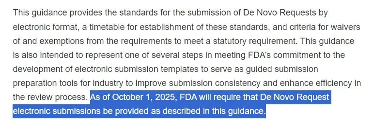 值得注意的是,該指南提到,2025年10月1日起,De Novo申請(qǐng)需使用eSTAR進(jìn)行提交。