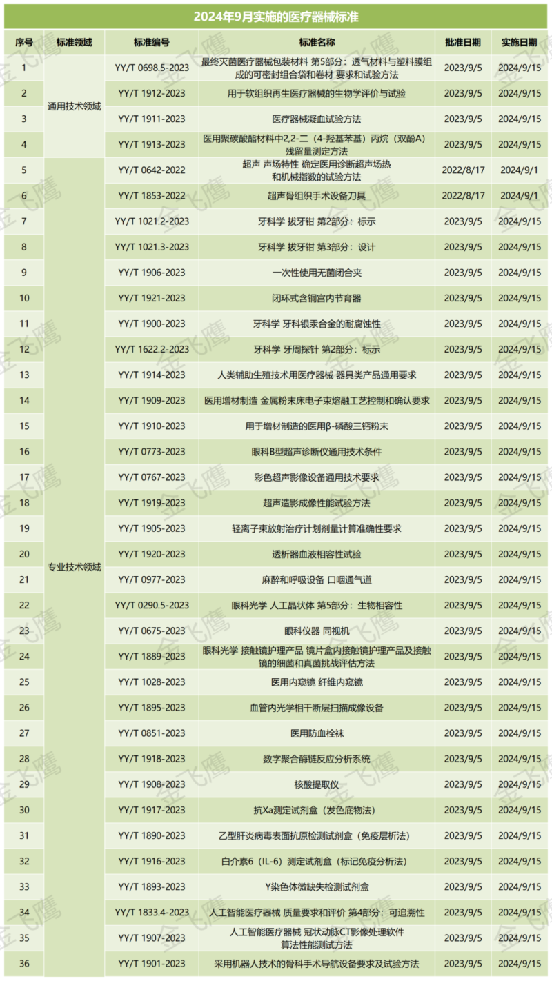 8月最后一個工作日,按照咱們的老規矩,在某月有較多醫療器械標準實施的情況下,我們都會匯總整理分享給大家,那么本期文章我們就給大家盤點一下2024年9月起即將實施的36項醫療器械標準,這其中有自2024年9月1日起實施的,也有自2024年9月15日起實施的,如YY/T 0698.5-2023《最終滅菌醫療器械包裝材料 第5部分:透氣材料與塑料膜組成的可密封組合袋和卷材 要求和試驗方法》、YY/T 0767-2023《彩色超聲影像設備通用技術要求》等,具體清單如下:
