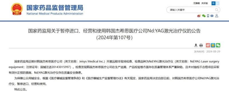 8月29日,國家藥監局發布公告稱,該局近期對韓國杰希思醫療公司(英文名稱:Jeisys Medical Inc.)開展遠程非現場檢查,檢查品種為Nd:YAG激光治療儀(英文名稱:Nd:YAG Laser surgery equipment;注冊證號:國械注進20143015997)。檢查發現韓國杰希思醫療公司在生產追溯、產品檢驗等方面存在質量管理體系嚴重缺陷,且未對抽檢不合格項目采取有效糾正預防措施,Nd:YAG激光治療儀存在質量安全隱患。