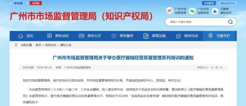 近日,廣州市市場監督管理局發布通知,該局定于9月3日-9月5日舉辦醫療器械經營質量管理系列培訓(線上直播),具體日程安排及培訓內容如下: