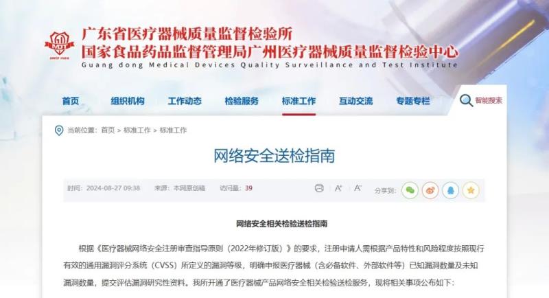 近日,廣東省醫療器械質量監督檢驗所就醫療器械產品網絡安全相關檢驗送檢事項公布如下:
