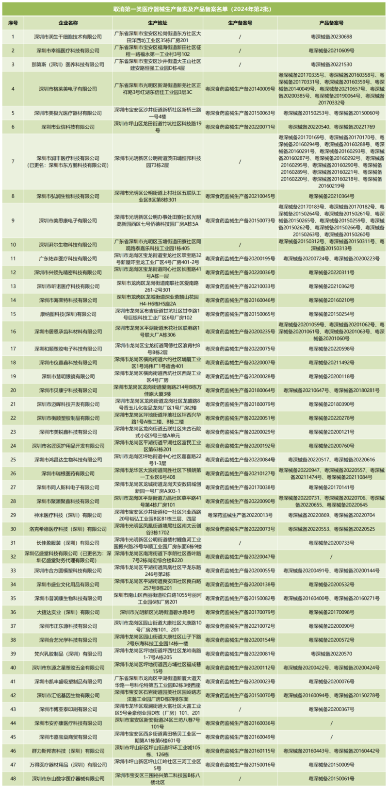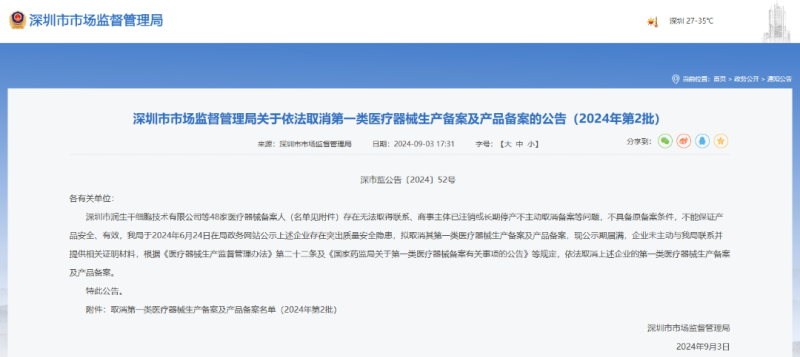 9月3日,深圳市市場監(jiān)督管理局官網(wǎng)發(fā)布一則取消第一類醫(yī)療器械生產(chǎn)備案及產(chǎn)品備案的公告,該公告指出,因深圳市潤生干細(xì)胞技術(shù)有限公司、深圳市幸福醫(yī)療科技有限公司、深圳市格萊美電子有限公司等48家醫(yī)療器械備案人存在無法取得聯(lián)系、商事主體已注銷或長期停產(chǎn)不主動取消備案等問題,不具備原備案條件,不能保證產(chǎn)品安全、有效,該局在公示期結(jié)束后決定取消這些企業(yè)名下的第一類醫(yī)療器械生產(chǎn)備案及產(chǎn)品備案,具體明細(xì)如下: