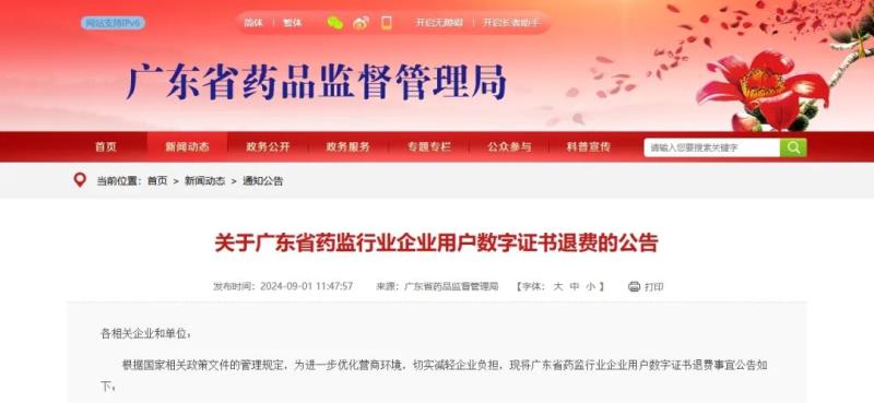 近日,廣東省藥監局發布《關于廣東省藥監行業企業用戶數字證書退費的公告》,具體內容如下:
