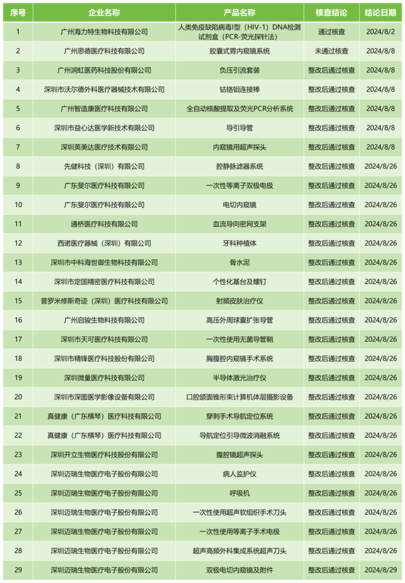 9月13日,廣東省藥監局官網公布2024年8月醫療器械注冊質量管理體系核查結果,包括普羅米修斯奇跡(深圳)醫療科技有限公司的射頻皮膚治療儀、深圳微量醫療科技有限公司的半導體激光治療儀、深圳邁瑞生物醫療電子股份有限公司的呼吸機共計29款產品,其中廣州海力特生物科技有限公司的人類免疫缺陷病毒I型(HIV-1)DNA檢測試劑盒(PCR-熒光探針法)核查結論為“通過核查”,廣州思德醫療科技有限公司的膠囊式胃內窺鏡系統核查結論為“未通過核查”,其余均為“整改后通過核查”。具體明細見下方表格: